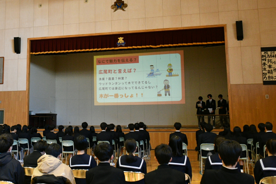 広尾高校の探究学習成果発表会に出席しました。生徒たちが「体験し、研究し、考察」した内容を学年ごとに、全校生徒、中学生、来賓の前で発表しました。動画や音楽を活用した構成で、裏付けも提示し検証を行うなど、とても感心しました。