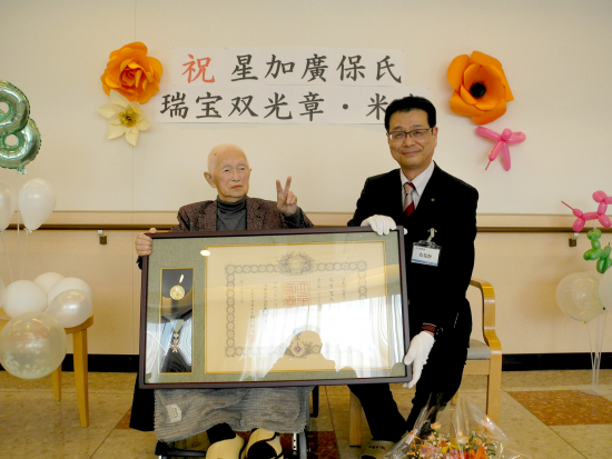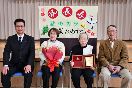 3月22日に満100歳を迎えられた藤田スゲさんに、長寿賞の盾と花束を贈呈しました。会場の老人ホームホールで、ご子息の敏和さんご夫妻や入所者の皆さんから、祝福の拍手が上がりました。本当におめでとうございます。